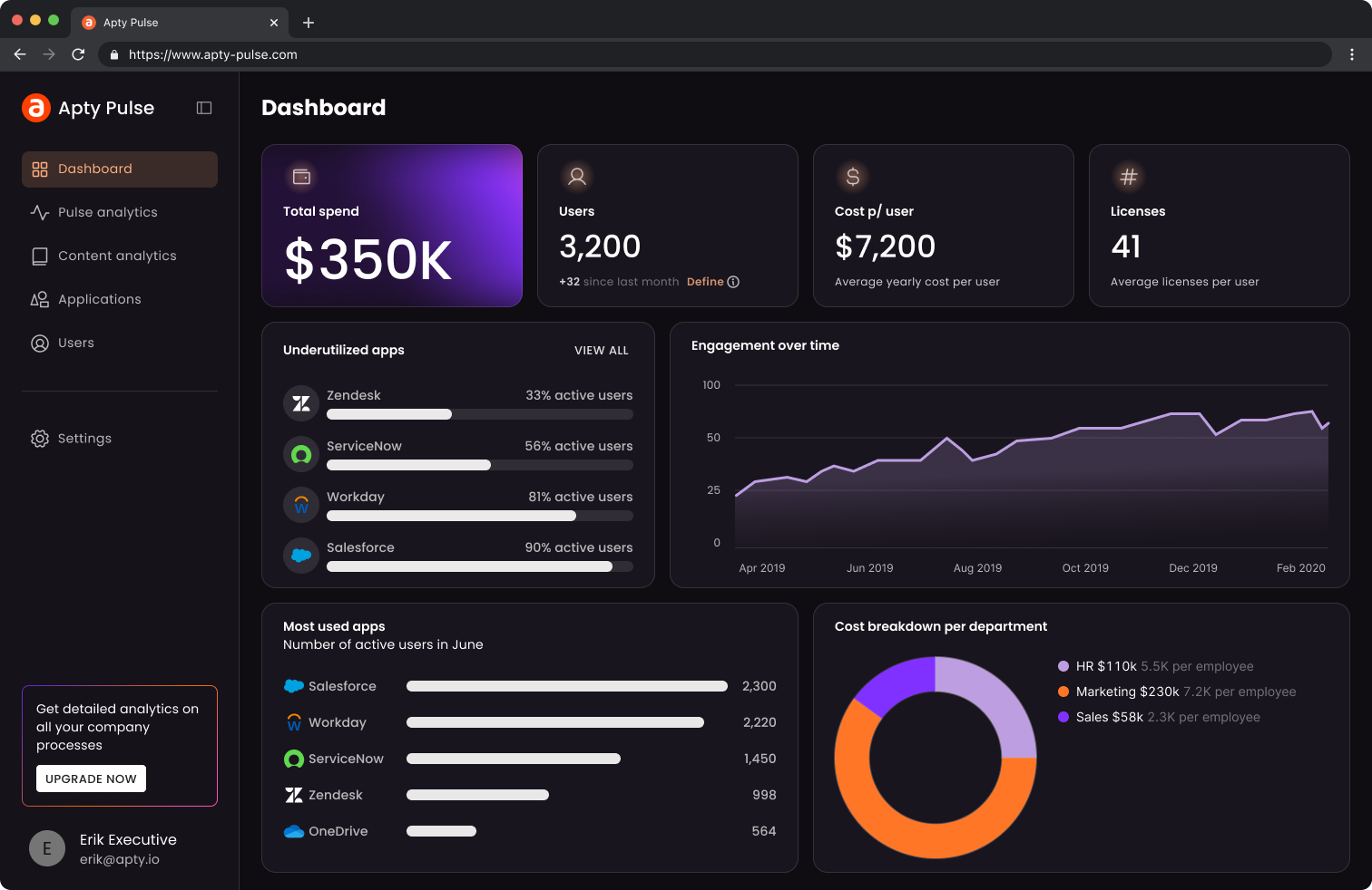 Apty Pulse™: This powerful analytics tool helps organizations identify unused and underutilized software, visualize user flows across key business processes, and generate AI-powered prescriptions for improving adoption.