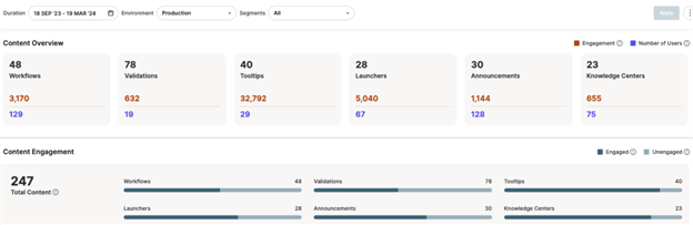Advanced Content Analytics: Apty provides comprehensive analytics across all content types, with detailed insights into user behavior, engagement trends, and step-level performance for every workflow. This enables data-driven decision-making about adoption strategies.