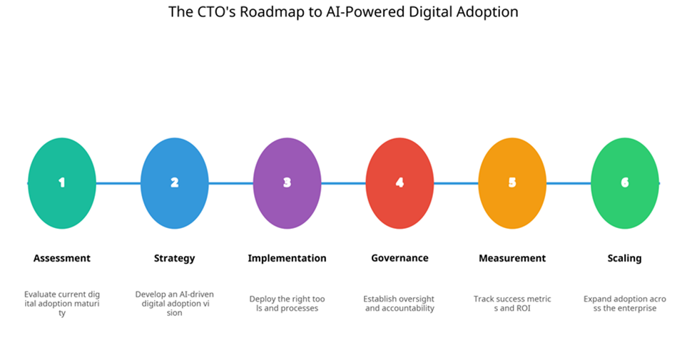 Implementing an AI-driven digital adoption strategy requires a structured approach, supported by custom AI development that ensures your adoption tools and automation are purpose-built for your enterprise environment. Here’s a practical roadmap for CTOs: