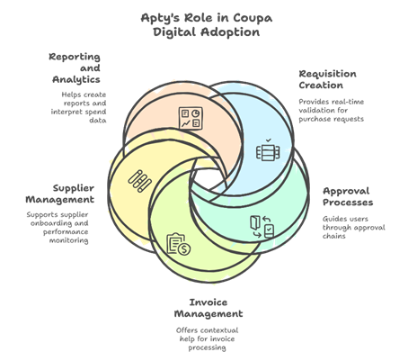 Now that you’re in full swing with Coupa, speeding up training and making sure your team uses the platform properly is essential. A Digital Adoption Platform (DAP) like Apty can help you do that.
