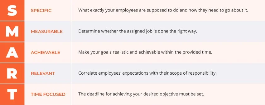 Leverage the SMART framework, shown above, to provide clarity to employees to help them understand their objectives.
