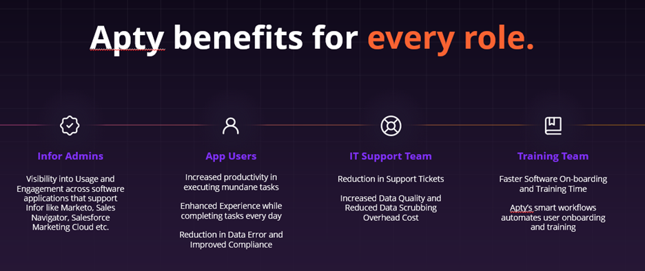 Example from Apty: For an organization implementing Infor across HR, finance, and supply chain teams, Apty tailored its guidance based on each department’s unique workflows. This role-based personalization led to faster adoption and reduced frustration among users.