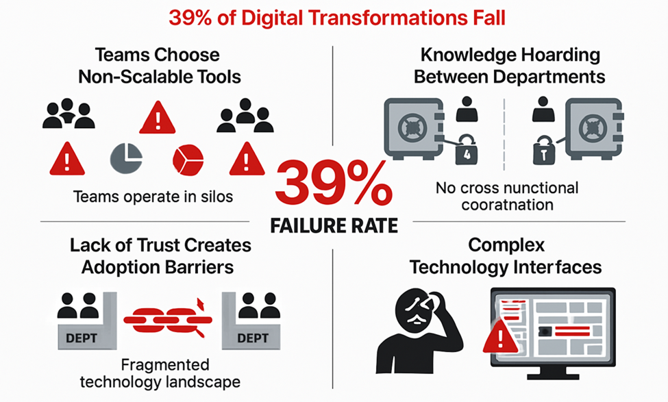 39% of digital transformation efforts fail due to resistance to change, yet enterprises continue deploying software without standardized adoption frameworks. This staggering statistic reveals a fundamental disconnect between enterprise ambitions and the realities of execution. While organizations invest millions in cutting-edge software solutions, they consistently underestimate the complexity of achieving consistent adoption across multiple teams, departments, and operational contexts.