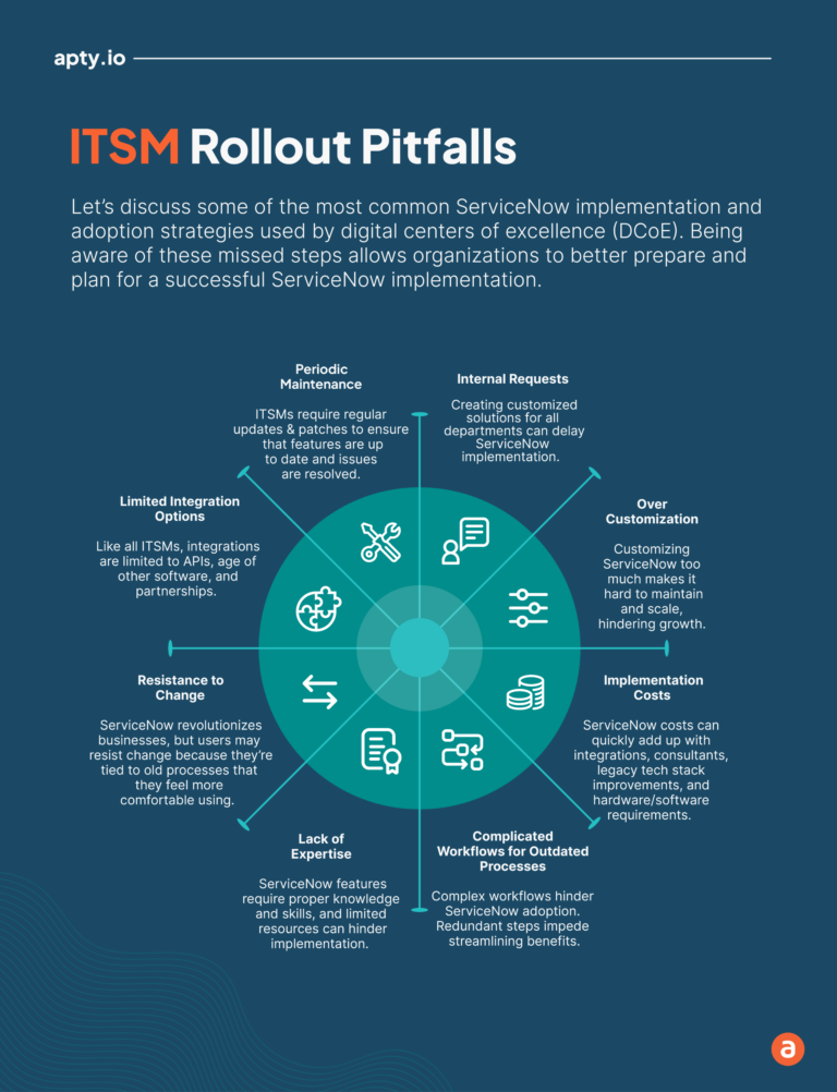 Let’s discuss some of the most common ServiceNow implementation and adoption strategies used by digital centers of excellence (DCoE) to overcome common pitfalls when rolling out an IT service management (ITSM) solution. Knowing these missed steps allows organizations to better prepare and plan for a successful ServiceNow implementation. Here are the nine common challenges faced during ServiceNow implementation: