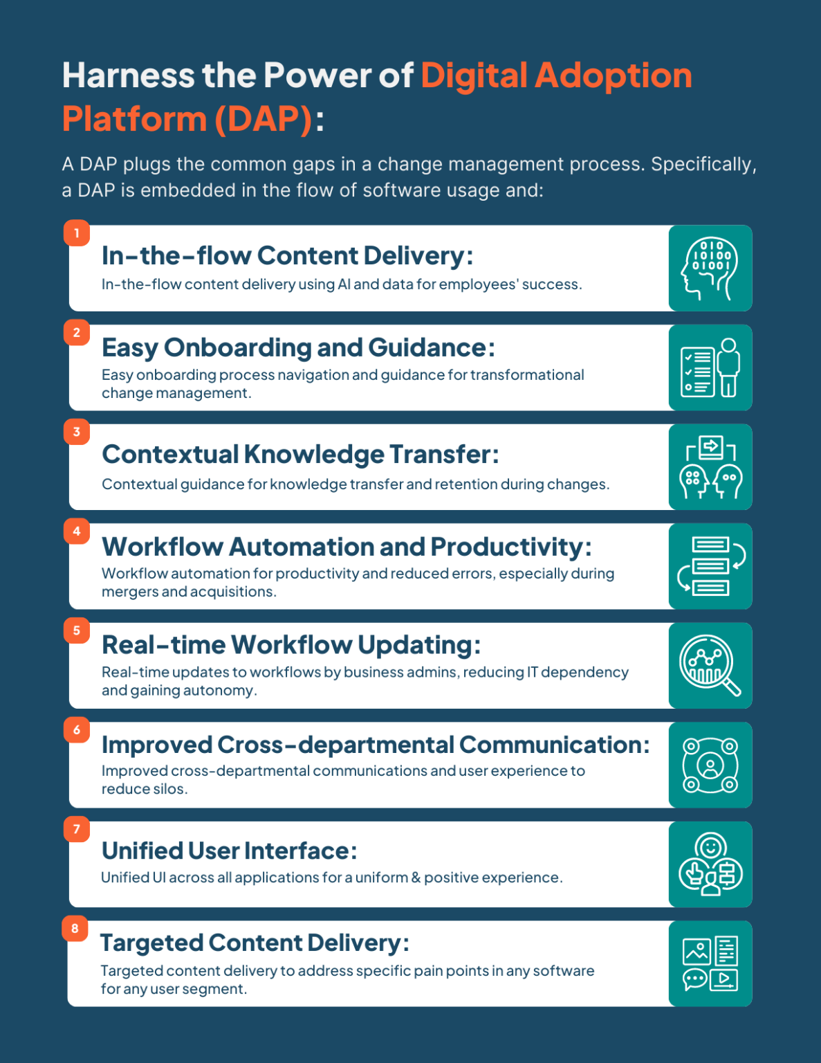 - User Onboarding and Training: DAPs provide in-app guidance and training, enhancing user adoption of new tools or processes, thus shortening learning curves and increasing overall efficiency.