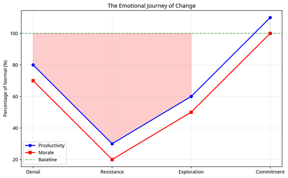 This emotional journey shows how both productivity and morale typically dip during the resistance phase before gradually improving through exploration and eventually exceeding baseline levels once commitment is achieved. Understanding where individuals and teams are in this journey allows change leadership in enterprises to provide appropriate support at each stage.